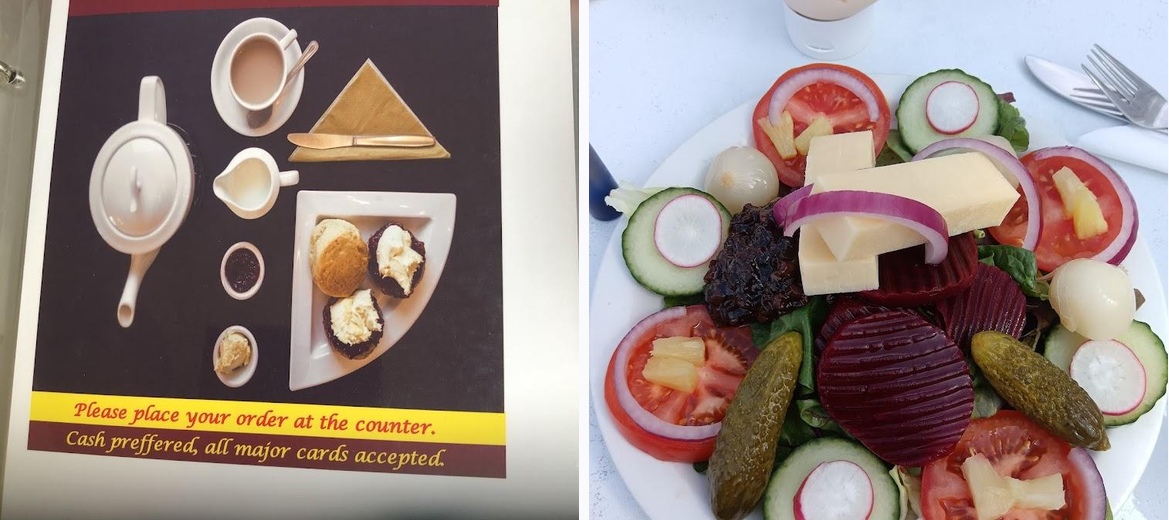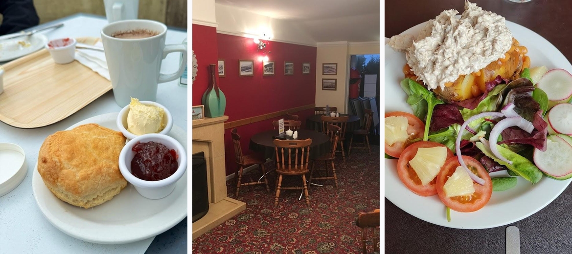 The menu features a range of tasty items including freshly baked scones, Greek salads, ploughman's lunches, and gluten-free options, catering to various tastes.